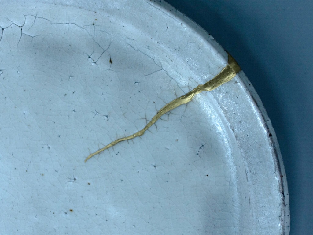 製作の途中、焼成過程で入ってしまったヒビや割れを「自然が作り上げたデザイン」と捉え直し、従来は失敗とされ、破棄されていた器を「金継ぎ」によって新たな価値ある作品へ昇華。道具土の跡も漆で塗りデザインの一部となる。